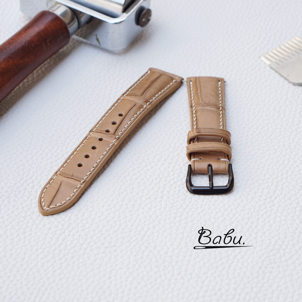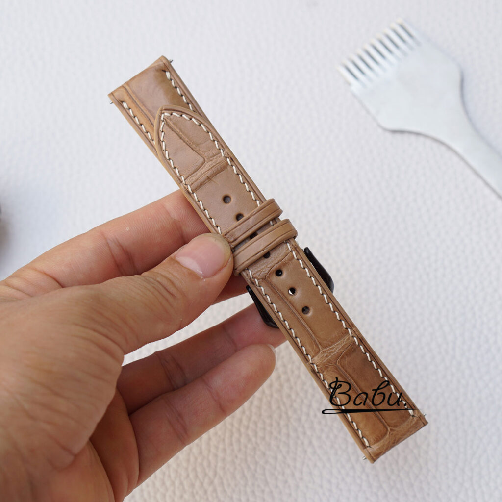 * The upper side is made of Premium Alligator leather. It’s famous for its firm texture and long-lasting durability. We also kept the natural grid of Alligator grain without too much modification.