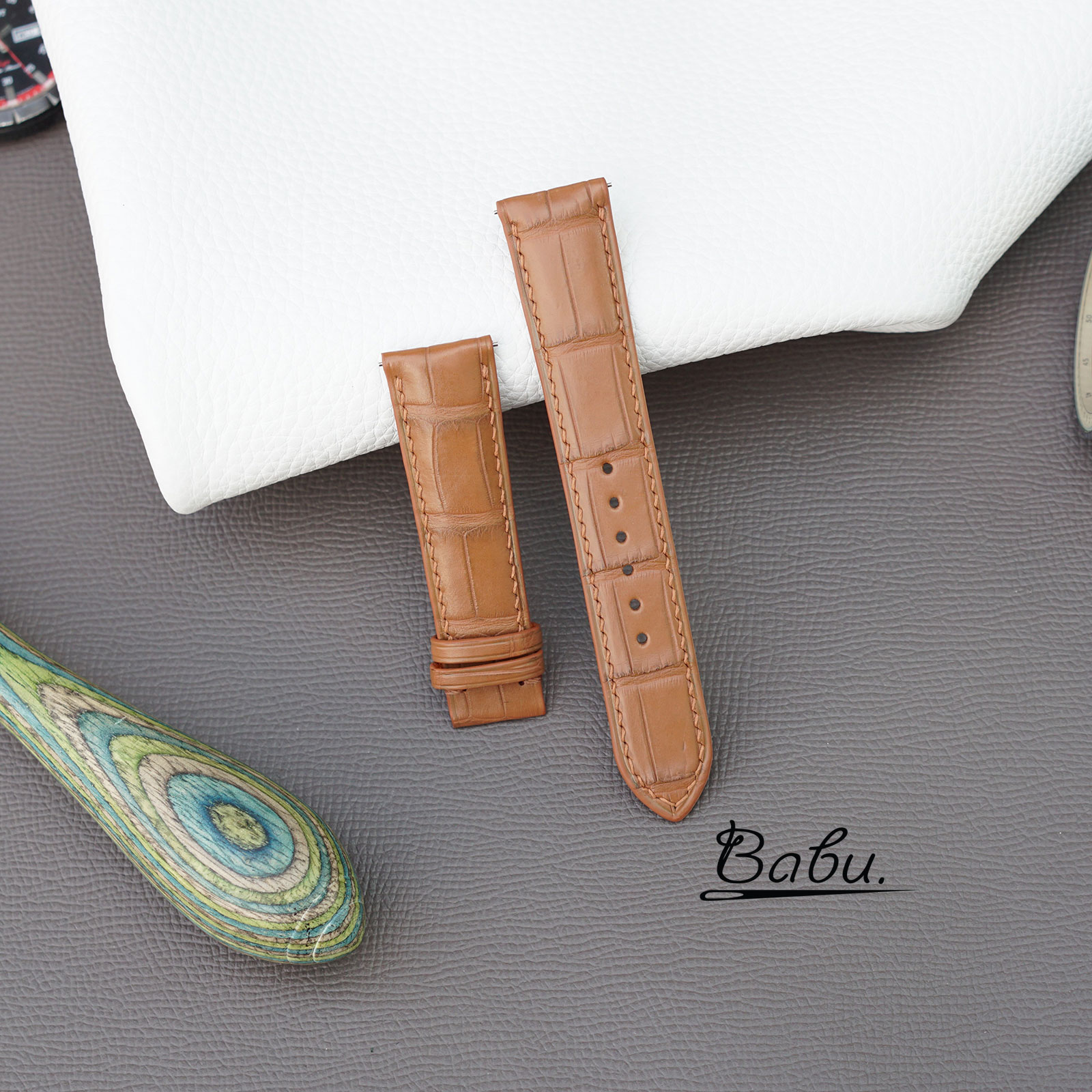 * The upper side is made of 100% Full grain Alligator leather. It’s famous for its firm texture and long-lasting durability. We also kept the natural grid of Alligator grain without too much modification.