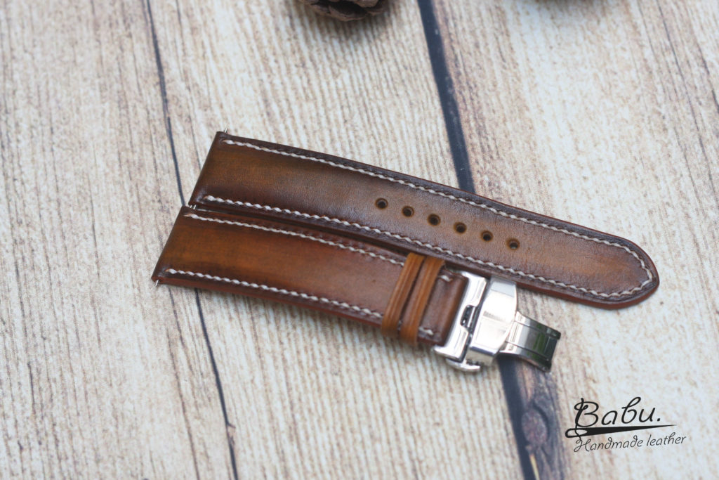 Our leather watch strap hand crafters make our product without any kind of mechanical use. We use the traditional ways of leather watch straps handcrafting to make the straps stylish. Our leather bands are customized to match perfectly with the design and request of the watch of the client. This brown vegetable tanned leather watch band is one typical example. Base on the request of the client, we dye the leather in new style called Omber. We blend gradually one color hue to another to move tints and shades from light to dark. This step creates the gradual transformation of color. This technique has become a popular feature for hair coloring, nail art. Sometime it uses in home decorating and graphic design.